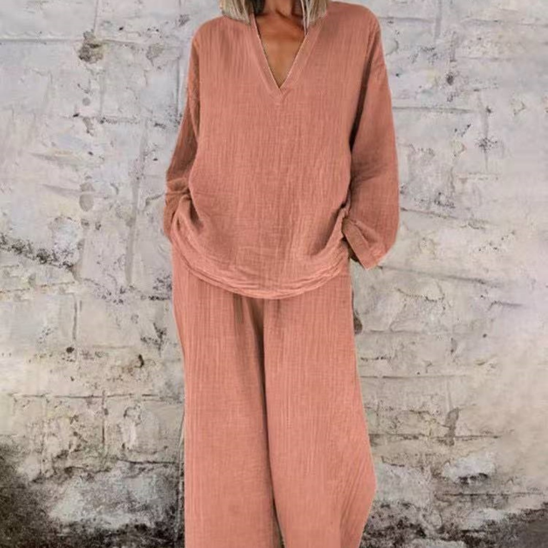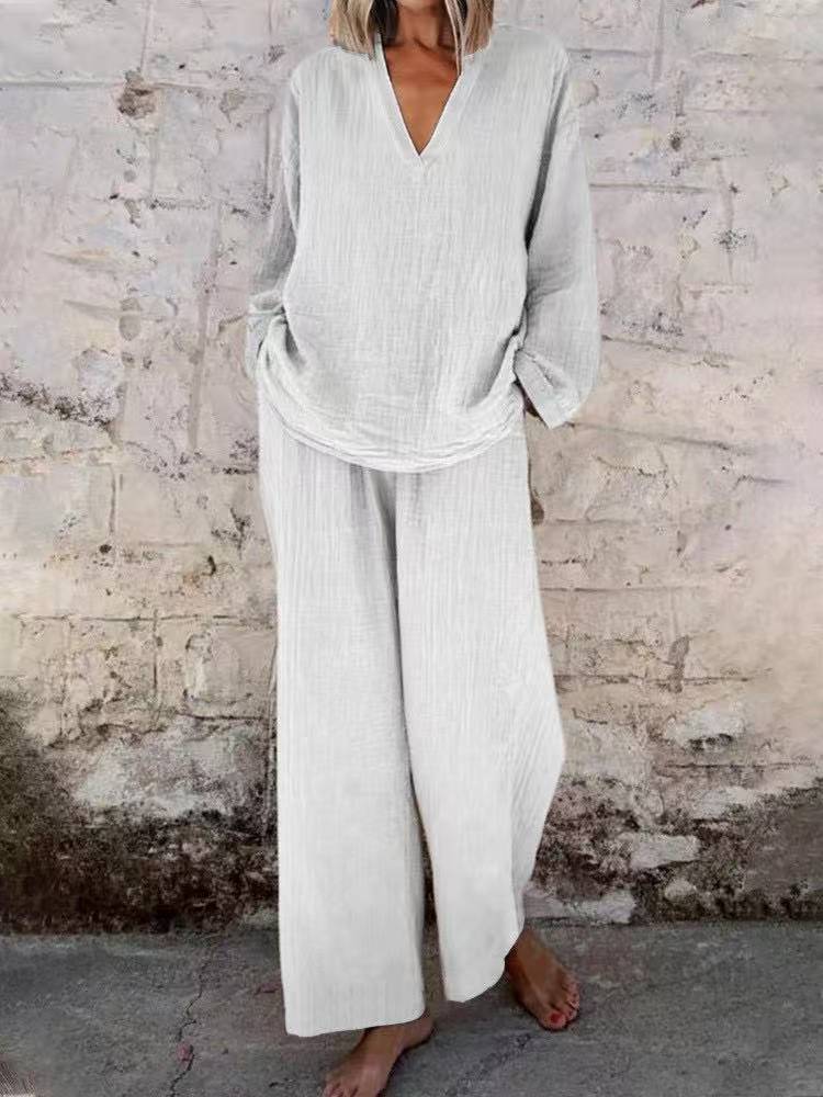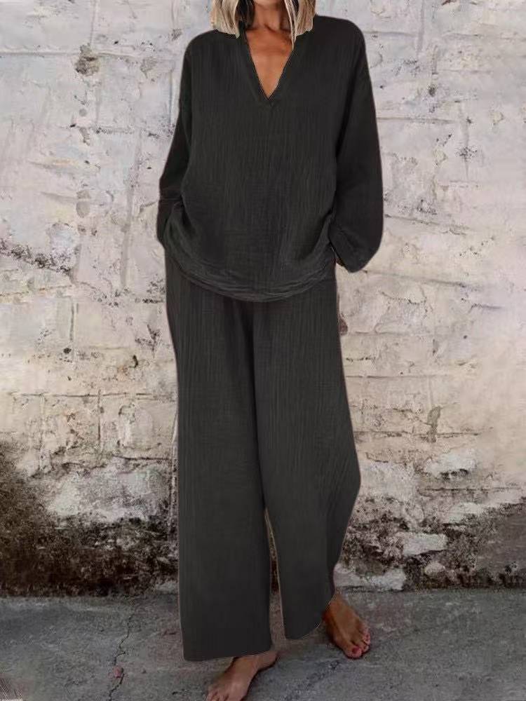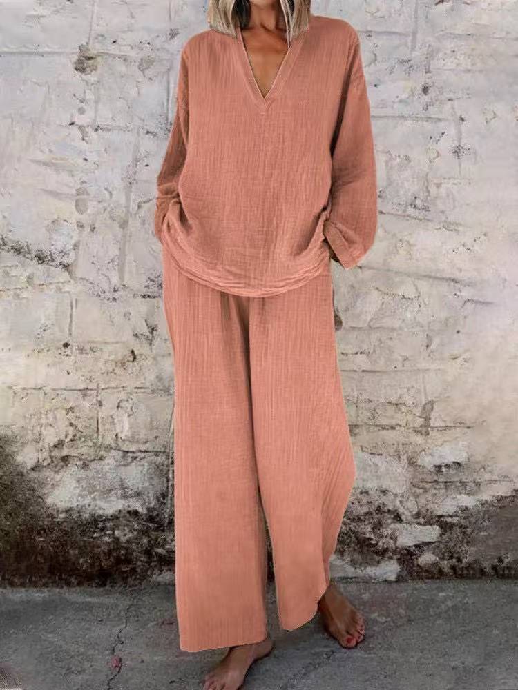 Women’s Solid Color Casual V-neck Pullover Long Sleeve Trousers Suit